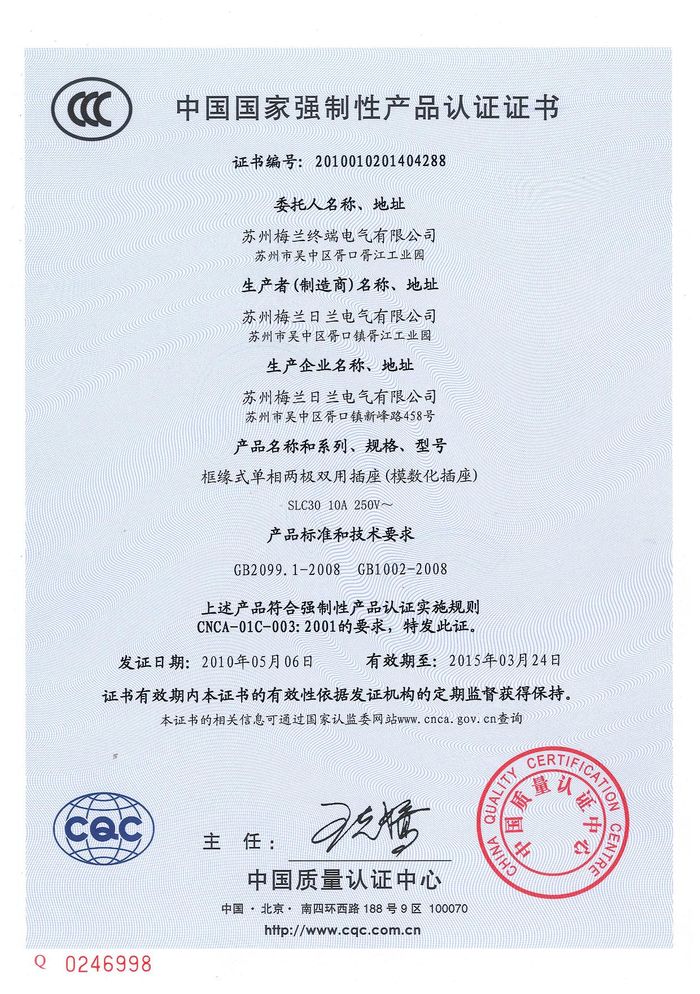SLC30模數(shù)化插座資質(zhì)證書(shū)