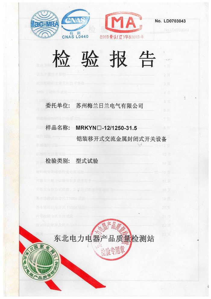 (成套)MRKYN封閉開關(高壓柜)資質(zhì)證書